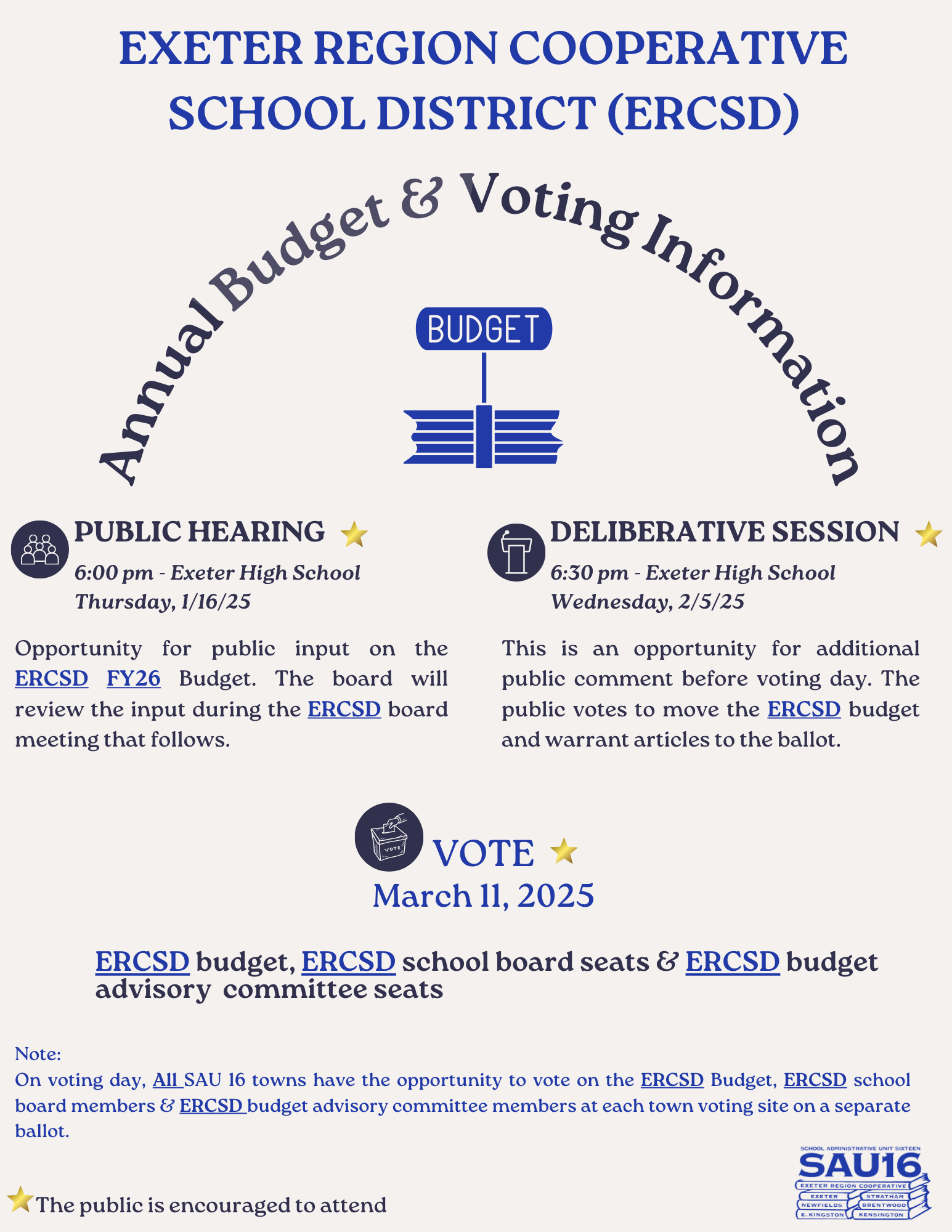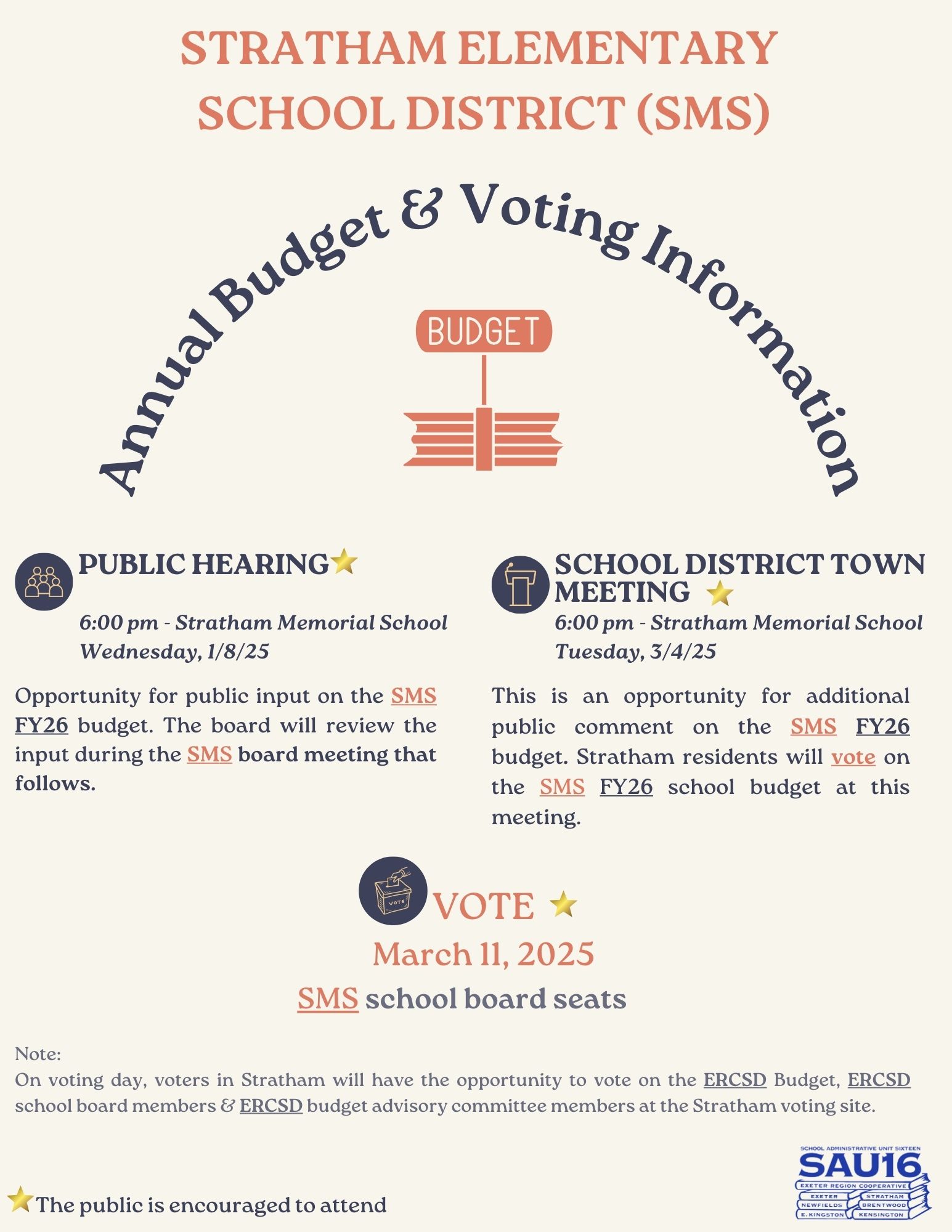 Mark your calendars! Please review these flyers for important meeting dates regarding Stratham Memorial School and the Exeter Region Cooperative School District.
