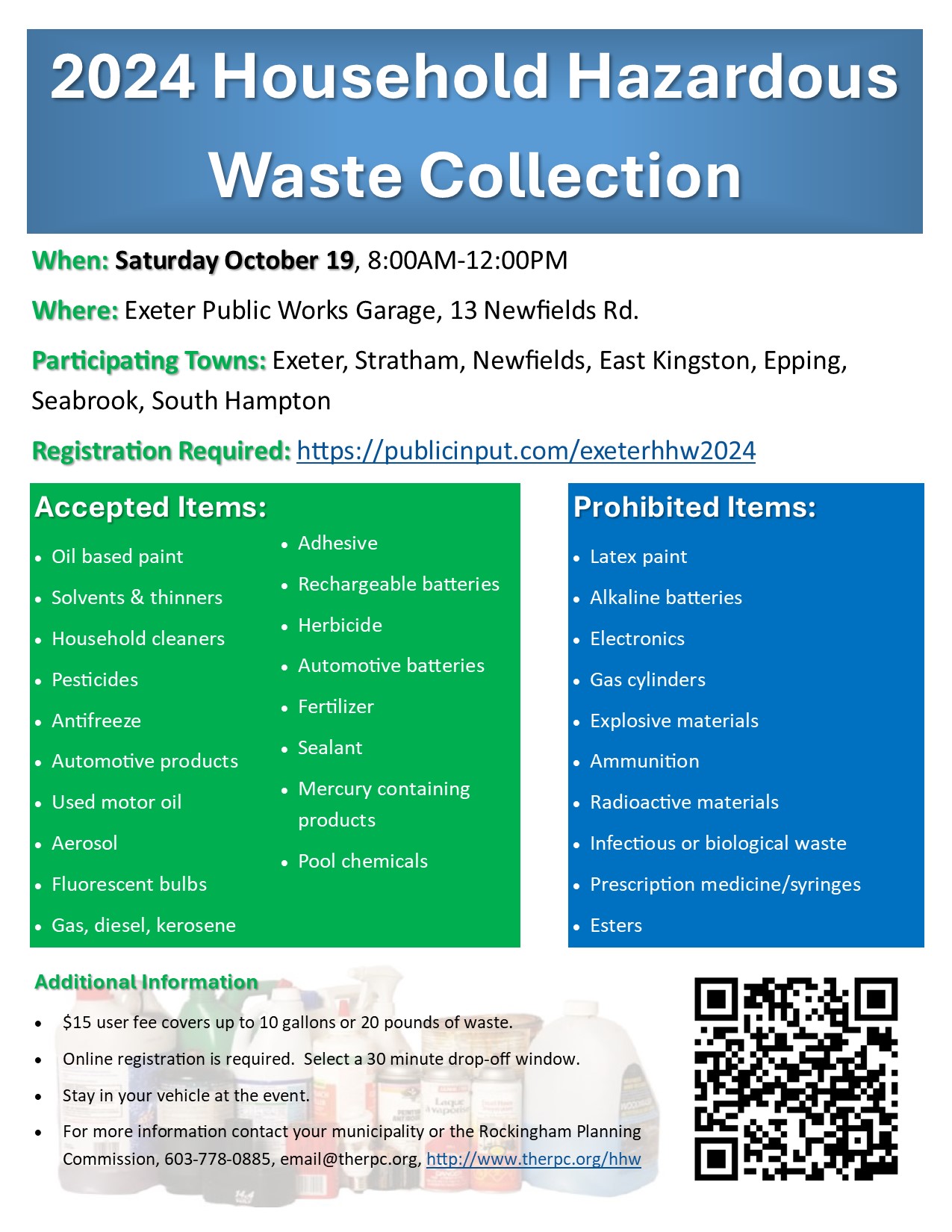 Mark your calendars -- the annual Household Hazardous Waste Collection Day will be held on Saturday, October 19th from 8:00 am - 12:00 pm at the Exeter Public Works Garage, 13 Newfields Rd. Registration is required. Click for details.