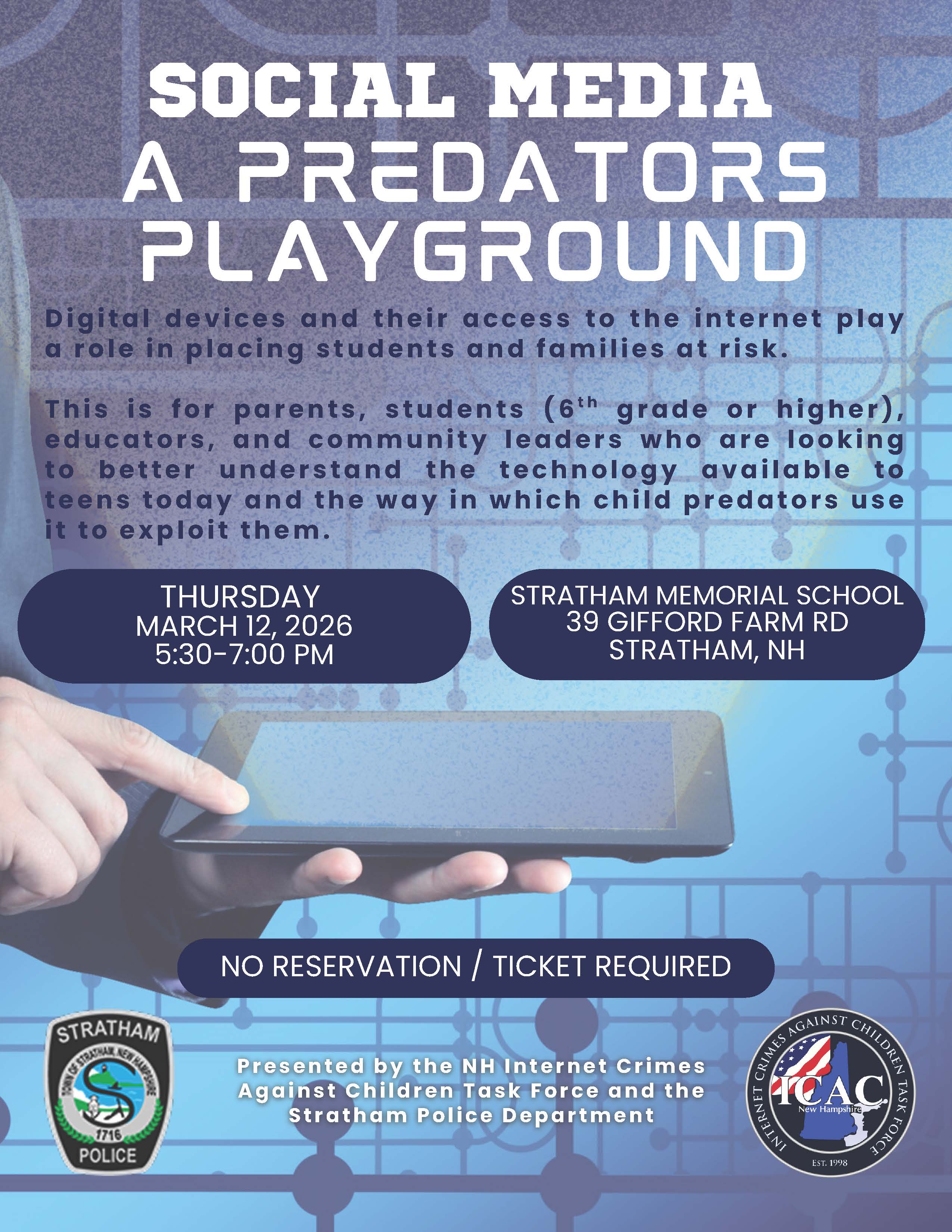 The NH Internet Crimes Against Children Task Force and the Stratham Police Department will hold a presentation to better understand the technology available to teens today and the way in which child predators use it to exploit them. This important presentation will be held on Thursday, March 12 at the Stratham Memorial School from 5:30 - 7:00pm. Details here.