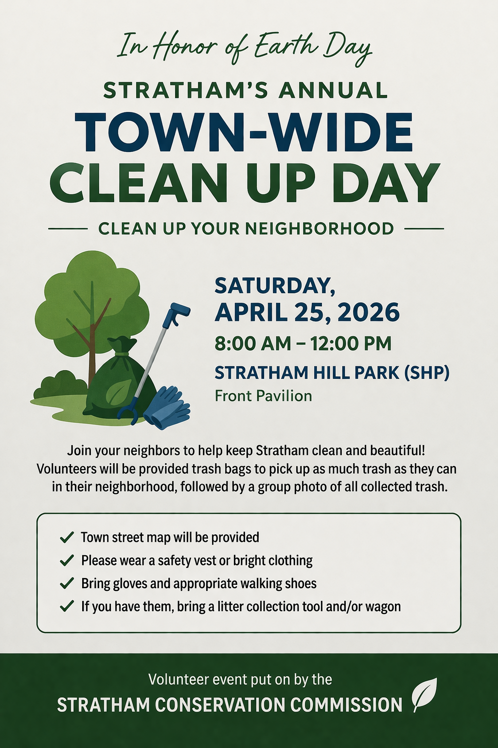 Help keep Stratham beautiful during this fun, family‑friendly volunteer day! Meet us on Saturday, April 25, (rain or shine) at the Front Pavilion at Stratham Hill Park between 9:00 am and 12:00 pm. Pick your favorite spot in the park—or anywhere in town—and pitch in.